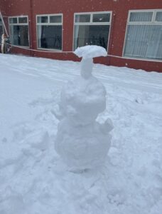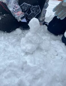 スキー場に到着した私たちは、予約していたスノボ教室の時間まで雪遊びをして暇をつぶすことにしました。ふかふかの雪に寝転がったり、綺麗な雪の玉を作ったりと、どれだけ遊んでもなお有り余る雪に、私はまるで夢のような気持ちでした。ひとしきり楽しんだ後はみんなで、生牡蠣による体調不良で急遽来られなくなってしまったHちゃんともう一人の出店同期であるAくんを模した雪だるまを作りました。