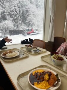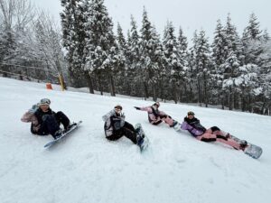 次にスノボ教室に参加し、インストラクターの方に板の扱い方から滑り方まで丁寧に指導していただきました。4人とも未経験でしたが先生のおかげで午後には見事、全員が滑れるようになり大満足のスノボ体験でした!